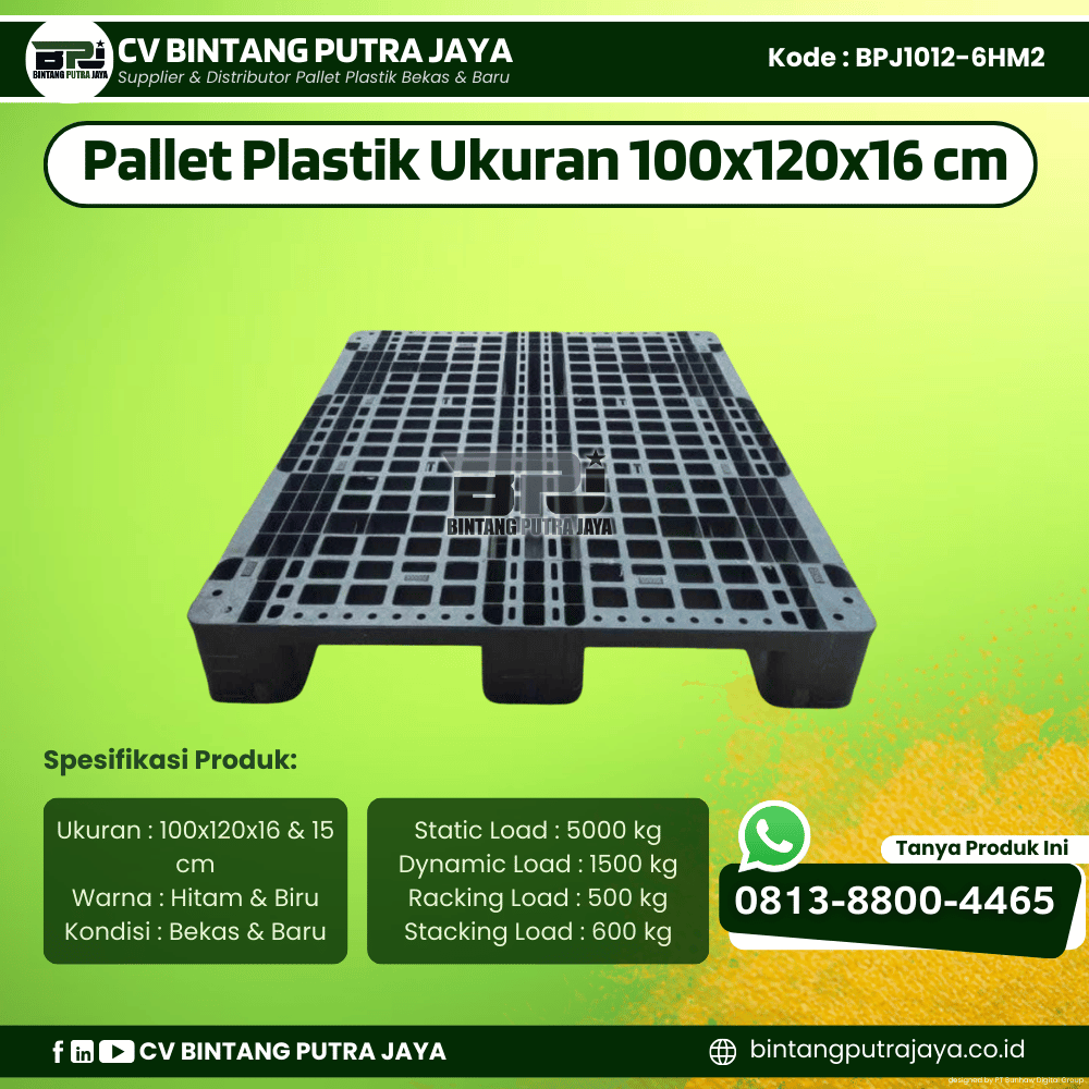 Di tengah pesatnya perkembangan industri logistik dan pergudangan, kebutuhan akan pallet plastik yang kuat, tahan lama, dan hemat biaya semakin meningkat. CV Bintang Putra Jaya menghadirkan Pallet Plastik BPJ1012-6HM2 dengan ukuran 100x120x16 cm yang cocok untuk berbagai aplikasi logistik. Baik Anda membutuhkan pallet dalam kondisi bekas atau baru, produk ini hadir untuk memenuhi kebutuhan Anda dengan harga yang sangat kompetitif dan kualitas yang terjamin.